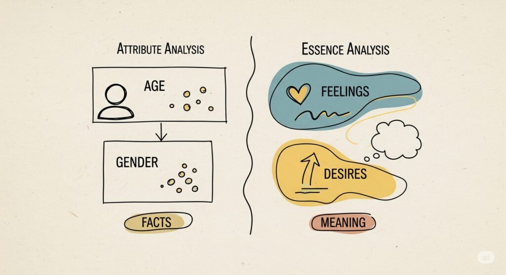 一方、本質分析とは、「なぜその人がその商品を買うのか」という理由を深く掘り下げることです。単にどんな人が買っているかだけでなく、その人が何を求めているのか、どんな課題を解決したいと思っているのか、といった心理的な要素やニーズを理解しようとします。